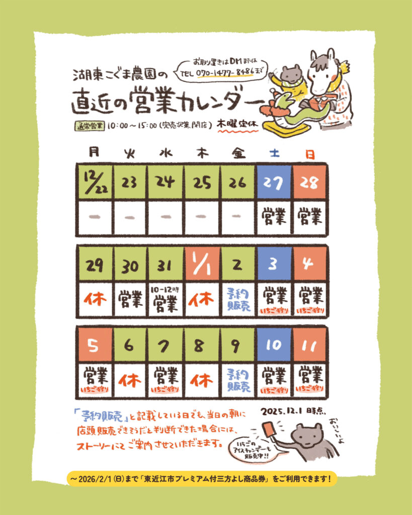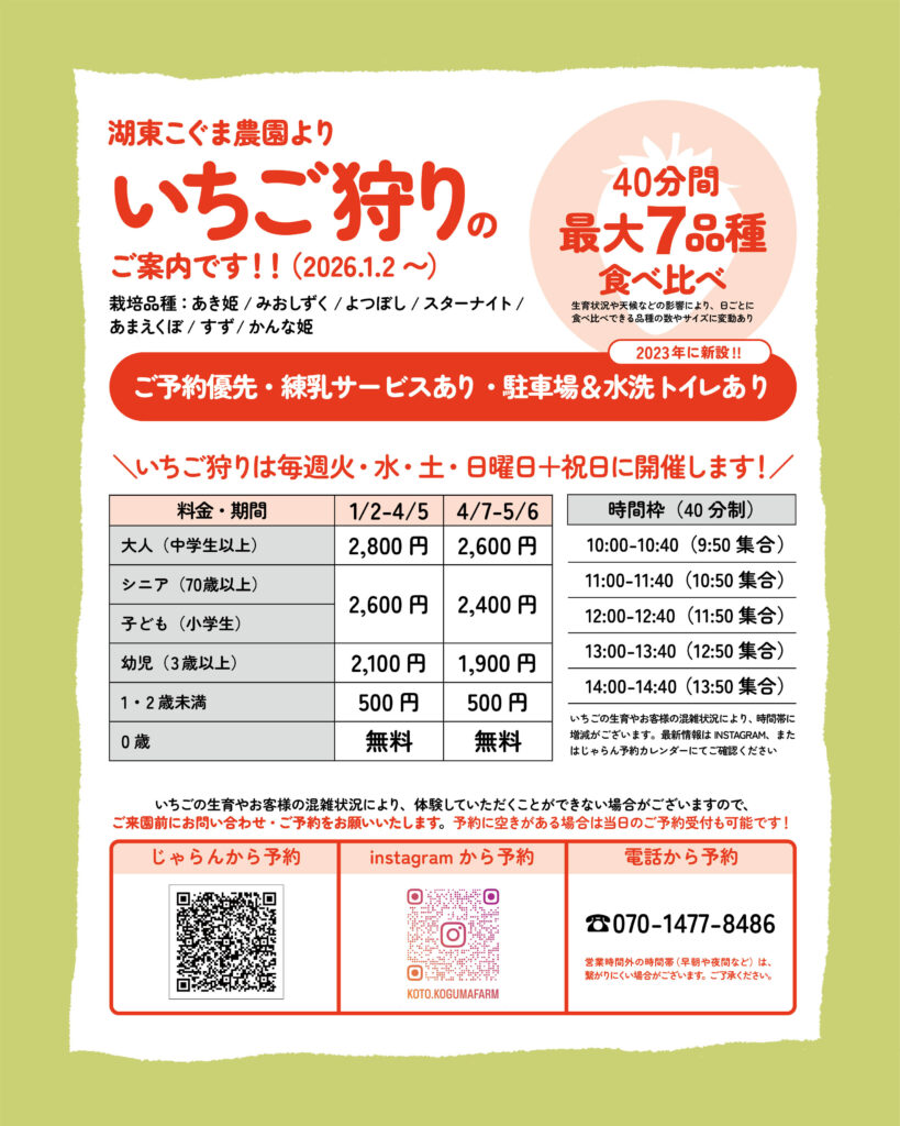 | 開園情報 | 軒先販売 12/27(土)〜5月頃まで いちご狩 2026/1/2(金)〜5月頃まで 営業 10:00〜15:00(完売次第、終了) 月・金曜は予約販売制でパック販売のみ |